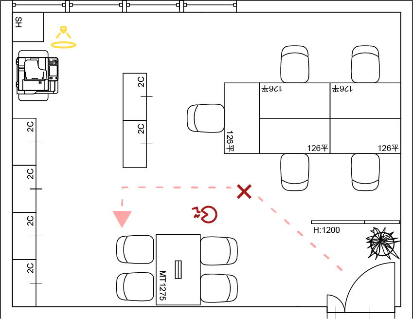 - 狭いだけじゃなくて、渋滞します。入口から奥に行く動線が会議テーブルにぶつかります。来客が来ると、全員が一回止まります。