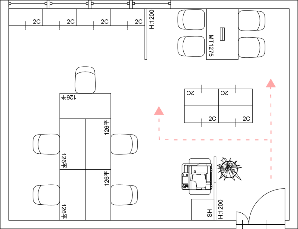 - 広いオフィスでは人気のレイアウトですね。図面にするとこうなります。
