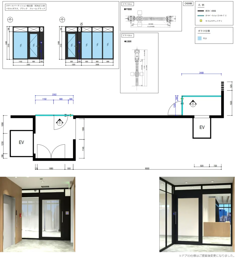 工事前には、平面図・立面図・パース図を作成し、入口まわりの見え方と動線が把握しやすい形でご提案しています。入口の管理方法だけでなく、ガラスで囲ったあとの圧迫感や受付との距離感まで確認しやすい内容です。