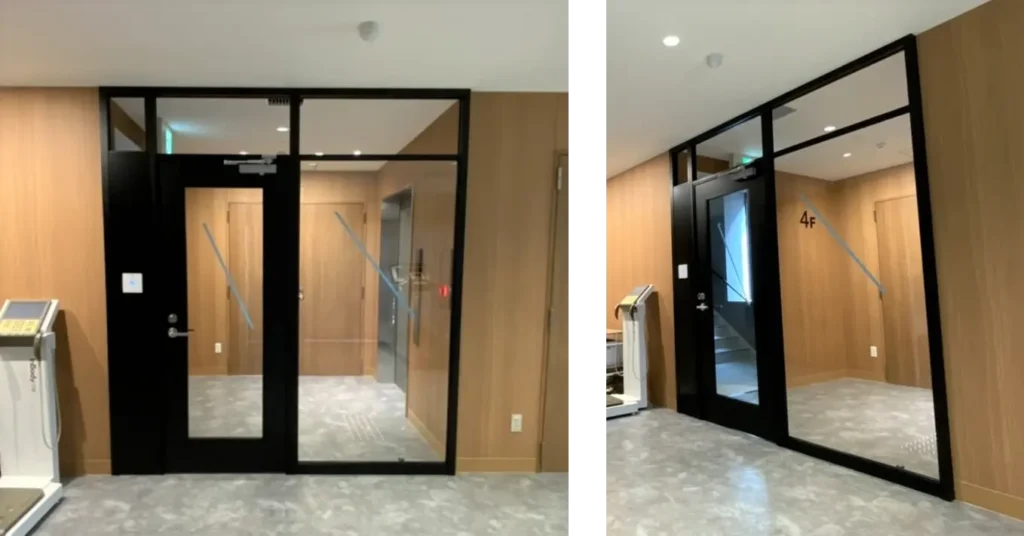 今回の工事では、クリニックの入口を単に仕切るのではなく、入退室を管理できること利用者が入りやすいことを両立した入口に変えています。ガラスパーテーションで区切り、セコムのICカード式電気錠を設けることで、関係者以外の出入りを管理しやすくしました。そのうえで全面ガラスにしたことで、閉じた印象を避けながら受付からの視認性も確保しています。セキュリティを高めたい一方で、来院される方に威圧感を出したくない施設に合う施工事例です。